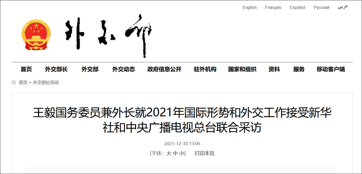 據外交部網站消息,2021年12月30日,國務委員兼外交部長王毅就2021年國際形勢和外交工作接受新華社和中央廣播電視總枱聯合採訪。