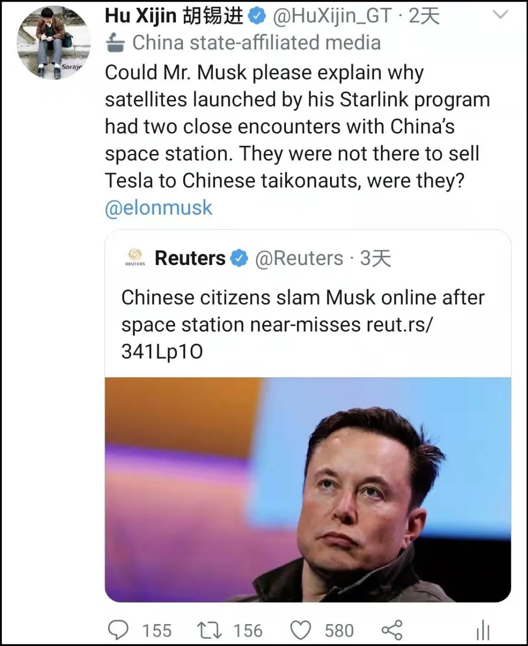 《環球時報》特約評論員胡錫進在其微信公眾號“胡錫進觀察”發文稱,他在國內外網上都發貼了,批評馬斯克SpaceX公司星鏈衞星接近中國空間站並對站內航天員安全構成了威脅,要求他做出解釋。