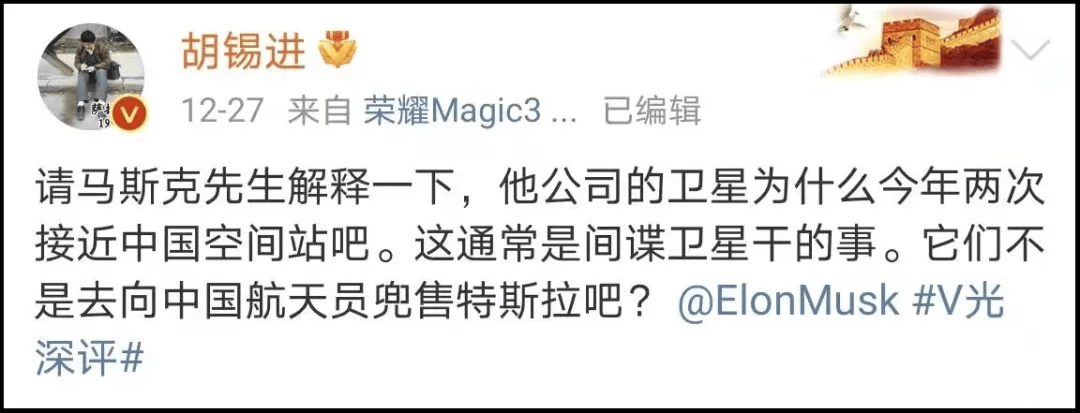 “美國之音”你講點武德!老胡什麼時候,説的哪句話煽動網民圍攻馬斯克了?不錯,我在國內外網上都發貼了,批評馬斯克SpaceX公司星鏈衞星接近中國空間站並對站內航天員安全構成了威脅,要求他做出解釋。