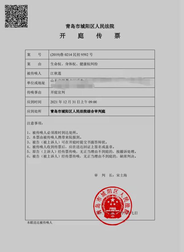 12月27日,青島市城陽區法院曾發開庭傳票傳喚江秋蓮,稱該案定於12月31日上午開庭宣判。