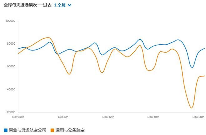 Flightaware的全球航班進港架次圖,可見聖誕假期明顯下降,而美國取消最為嚴重。