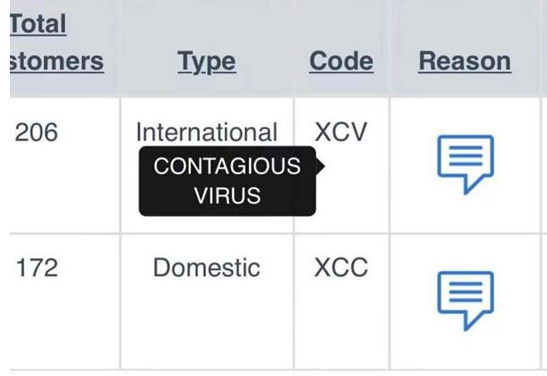 美國航司內部系統上備註的航班取消原因:傳染性病毒