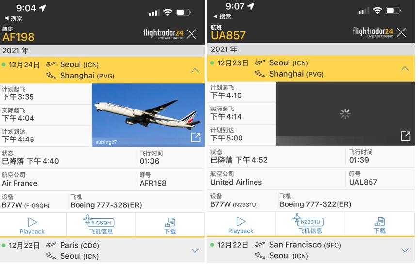 12月23日與24日,美聯航和法航都順利執行了同樣的航線飛行。