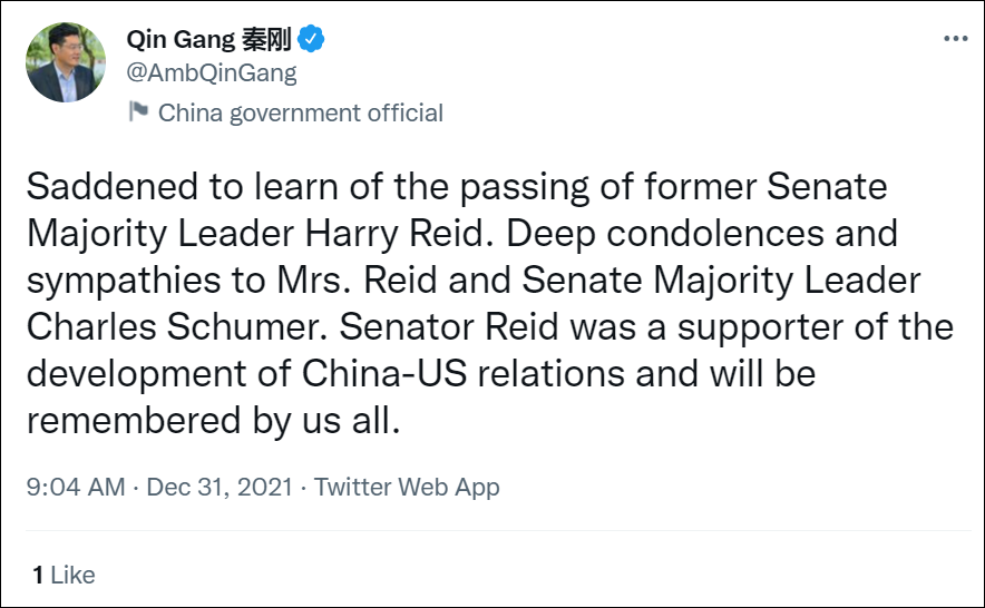 12月31日,中國駐美國大使秦剛在推特上表示,悲痛獲悉美國參議院前多數黨領袖哈里·瑞德(Harry Reid)去世,向瑞德夫人和美國參議院多數黨領袖舒默表示哀悼和同情。