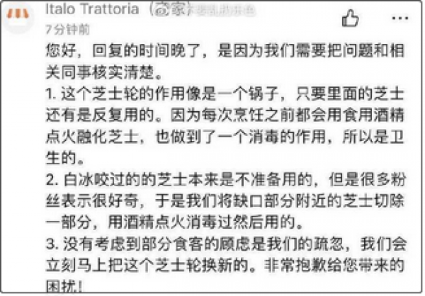 另據網傳圖片,這位顧客也在大眾點評上進行了投訴,商家當時回應,這個芝士本來不準備用,但“很多粉絲表示很好奇”,於是將缺口部分附近的芝士切除了一部分,用酒精點火消毒鍋然後用的。