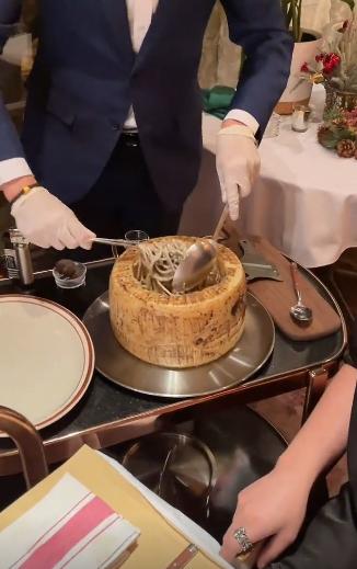 這道菜需要現場製作,用火點燃芝士輪,並將意大利麪放入攪拌。