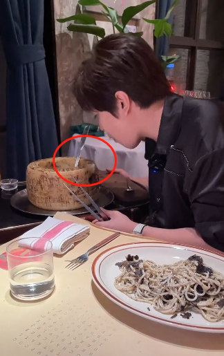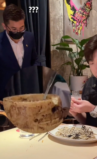 視頻中,他前往了一家上海意大利餐廳,點了一個特色的“芝士車輪松露意大利麪”。