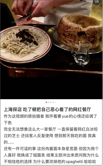 29日,有一名上海的顧客在小紅書發帖表示,自己在去意大利餐廳Italo Trattoria吃“芝士車輪松露意大利麪”時,看到芝士輪有一個缺口。後來發現,這個缺口是抖音美食博主白冰在拍攝探店視頻時咬的。