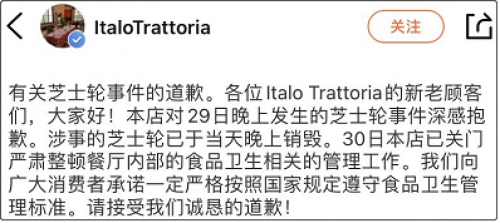 31日凌晨,涉事餐廳在大眾點評上再次發佈關於芝士輪事件的道歉,表示已經銷燬了被咬過的芝士輪,並於30日關門整頓。