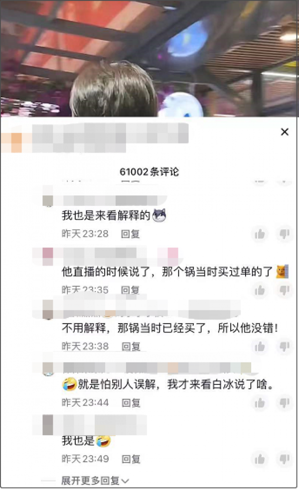 隨着事件發酵,也有人湧入白冰的抖音評論區詢問真實情況。有網友留言回覆,表示白冰在直播的時候澄清過,當時他已經為那個芝士輪買過單了。