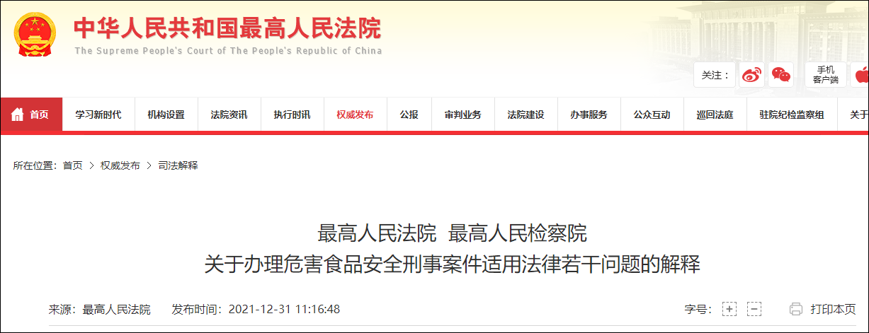 第二十六條 本解釋自2022年1月1日起施行。本解釋公佈實施後,《最高人民法院、最高人民檢察院關於辦理危害食品安全刑事案件適用法律若干問題的解釋》(法釋〔2013〕12號)同時廢止;之前發佈的司法解釋與本解釋不一致的,以本解釋為準。