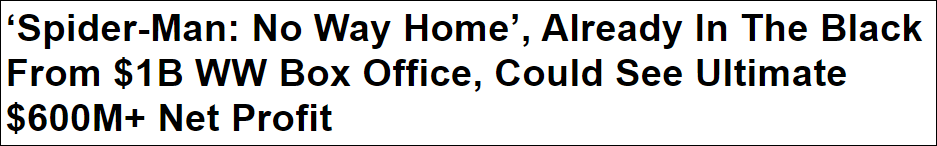 據Deadline 27日援引好萊塢電影財物分析師的推算,《蜘蛛俠:英雄無歸》在美國國內總收入加上全球影院租金約12.3億美元(78.4億元人民幣)。減去全球範圍內的P&A、生產成本、參與費用和剩餘費用共6.2億美元(39.5億元人民幣),《蜘蛛俠:英雄無歸》淨利潤將達6.1億元(38.8億元人民幣),僅次於《復仇者聯盟4》的8.9億美元(56.7億元人民幣)。