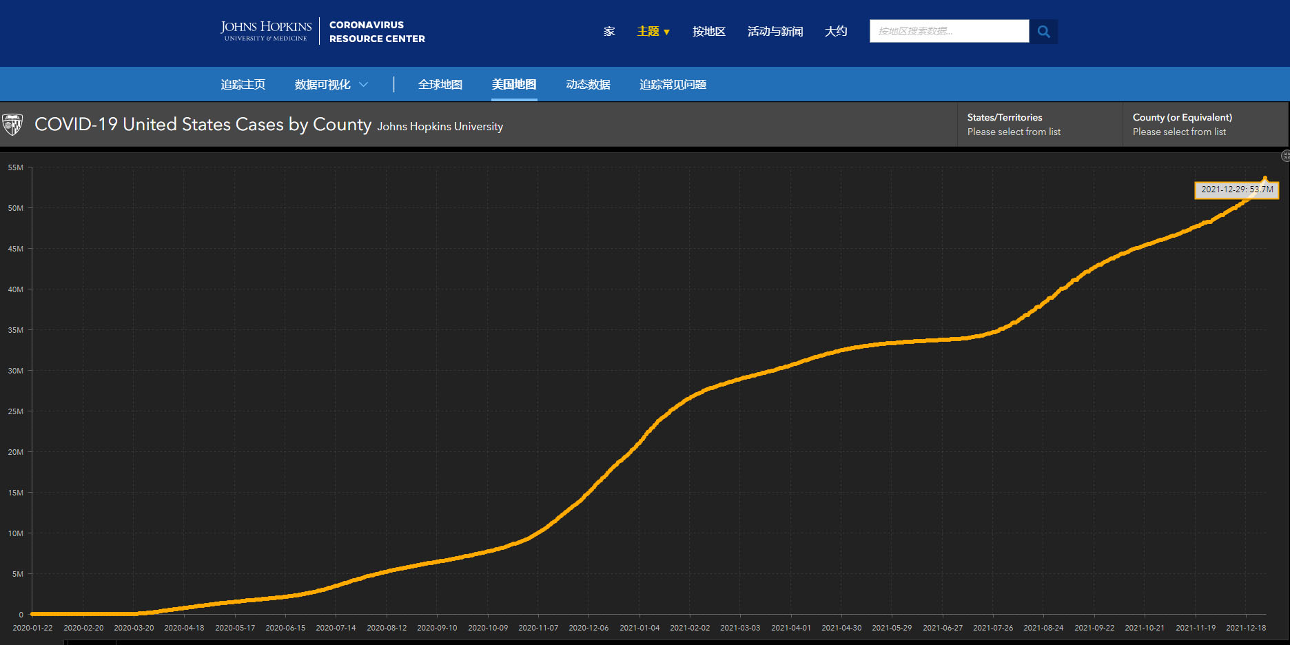 例如,北京時間12月17日6時22分,美國累計確診病例為50493975例。到了北京時間12月29日6時22分,美國累計確診病例就達到53105450例。12天新增確診就逾261萬例。