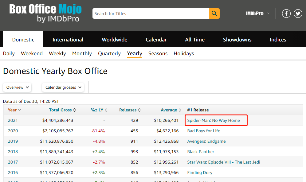 美國著名電影票房網站BoxOfficeMojo顯示,2021年全球總票房逾44億美元(約合280.4億元人民幣),電影《蜘蛛俠:英雄無歸》年度票房居第一。