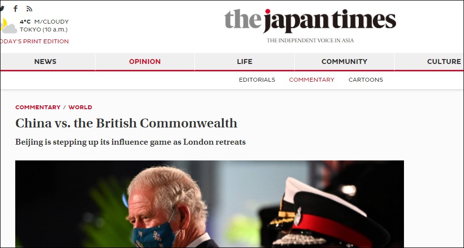 在畫好了“中國試圖滲透英聯邦國家的國家安全與防務”這張“宏偉藍圖”後,《日本時報》敦促英國敲響警鐘,宣稱英聯邦遠不是英國過去情感的遺留物,而是處理和遏制中國巨人的關鍵因素。