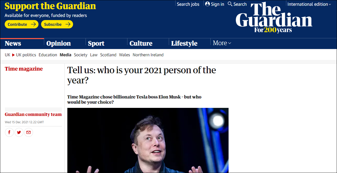 整起事件還要從12月15日説起,當天,《衞報》網站發佈了一篇題為“告訴我們:誰是你的2021年度人物?”的文章,呼籲讀者推薦他們的年度人物提名。