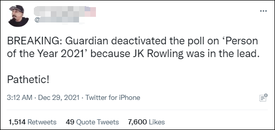 “突發事件:《衞報》取消了‘2021年年度人物’的投票,因為J.K.羅琳領先。真可悲!”