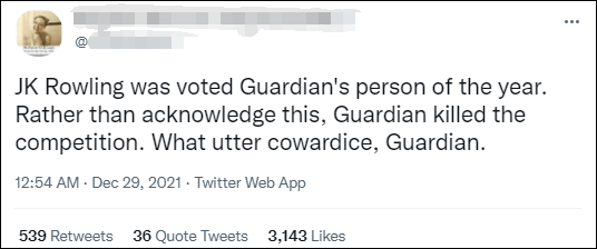 “J.K.羅琳當選《衞報》年度人物。《衞報》非但沒有承認這一點,反而扼殺了競爭。真是太懦弱了,《衞報》。”