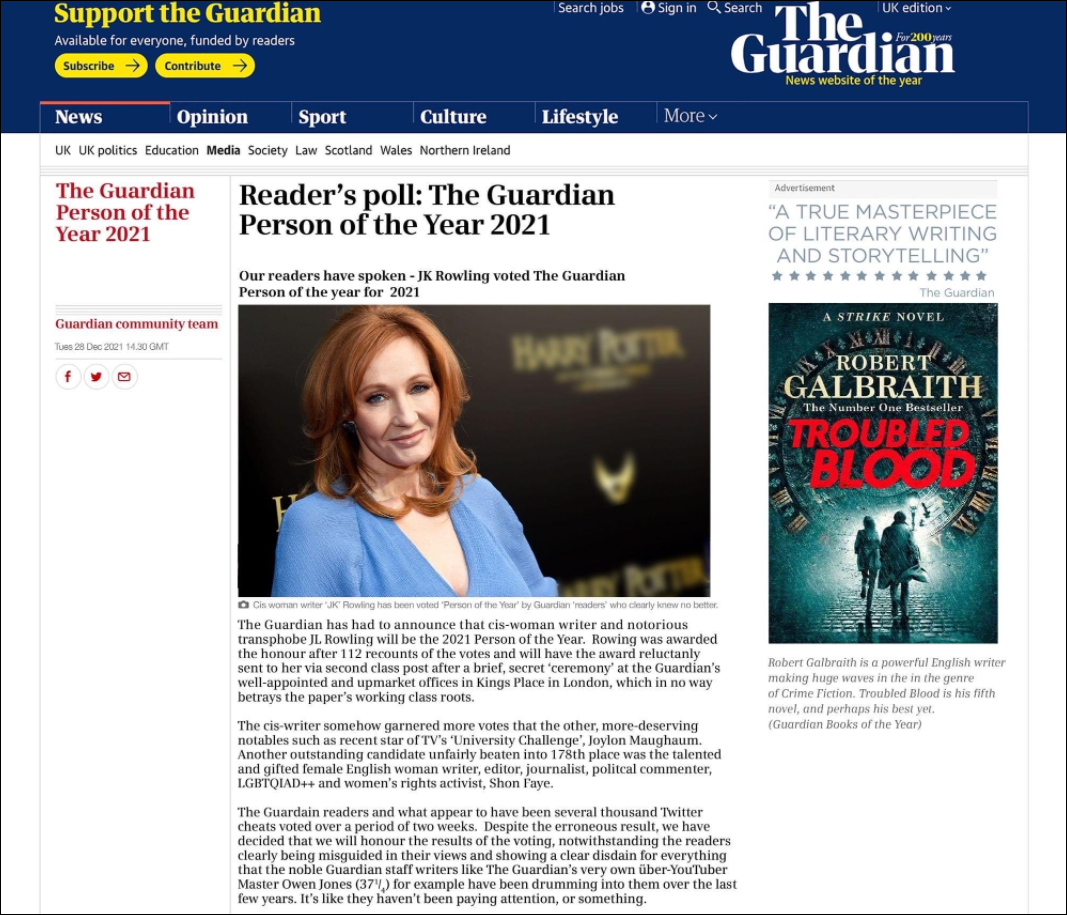 甚至還有人PS了一篇假的《衞報》文章來諷刺該報的操作,在這篇文章中,網民仿照《衞報》的口吻寫道:“《衞報》不得不宣佈,順性別女性(出生時生物性別是女性,自己也覺得自己是女性)作家、臭名昭著的變性人恐懼症患者J.K.羅琳將成為‘2021年的年度人物’。羅琳在經過112次重新計票後獲得了這一榮譽,在位於倫敦國王廣場、設備齊全且高檔的《衞報》辦公室舉行了一個簡短、秘密的‘儀式’後,《衞報》將不情願地通過二等郵件(便宜但寄件耗時長)將獎項發給她。”
