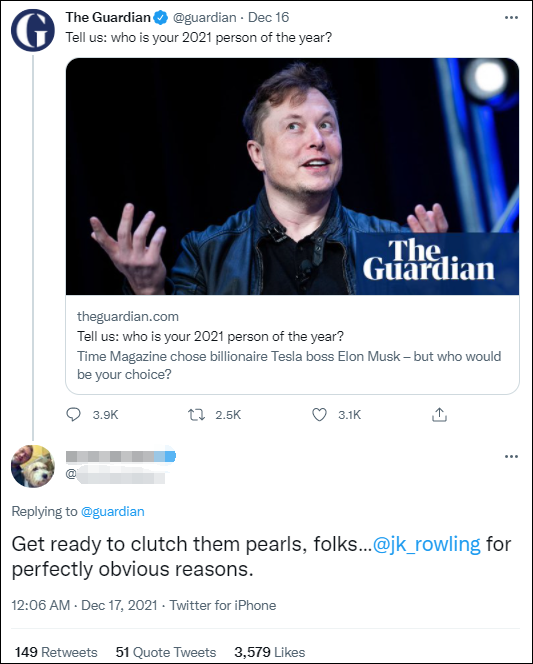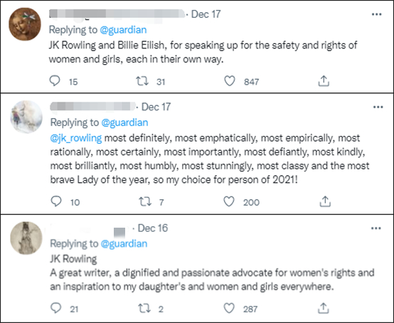 而通過《衞報》這篇文章下的推特留言可以看到,許多網民在投票剛開始,就提名羅琳當選“2021年度人物”。