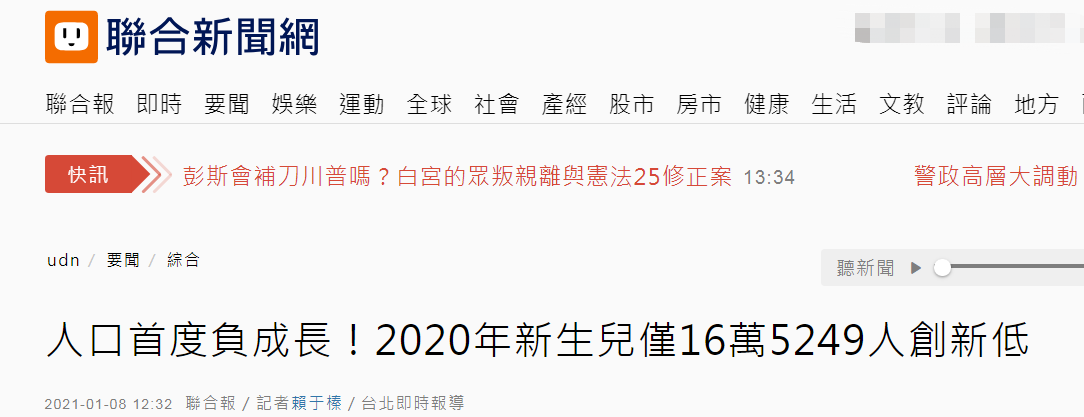 報道稱,台灣2020年死亡人數比出生人數多7907人,年自然增加率為-0.34‰,人口首度呈現負增長。