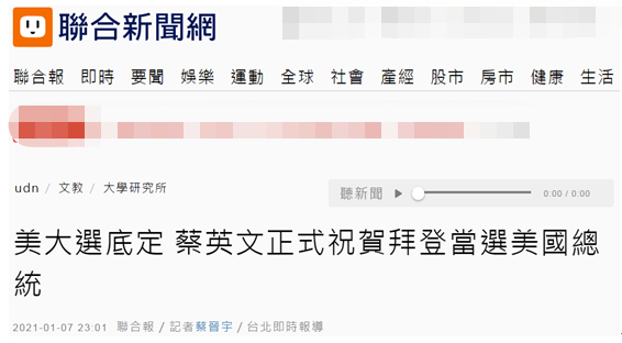美國國會參議院議長、副總統彭斯當地時間7日凌晨在聯席會議上宣佈拜登勝選。他表示,拜登“獲得306張選舉人票”,特朗普“獲得232張選舉人票”。據聯合新聞網報道,台灣“總統府”發言人張惇涵7日晚宣稱,蔡英文代表台灣“政府”與人民,誠摯祝賀拜登順利當選美國新任總統,以及賀錦麗當選美國新任副總統;蔡英文還期盼,未來美國政府在拜登總統的領導下,各項施政順利、國家發展昌盛,“台美關係”能夠持續深化云云。