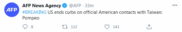 【環球網報道】最後的瘋狂?!法新社剛剛消息,美國國務卿蓬佩奧9日在推特上發文,宣稱美方將停止美國官方在與台灣接觸上的限制。