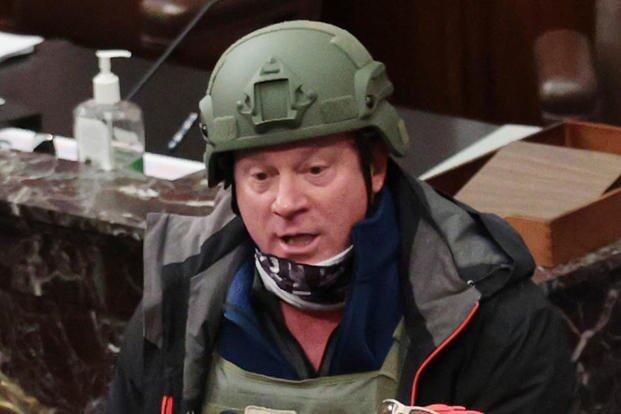 身着防彈衣、帶着防彈頭盔的布洛克進入國會大廈