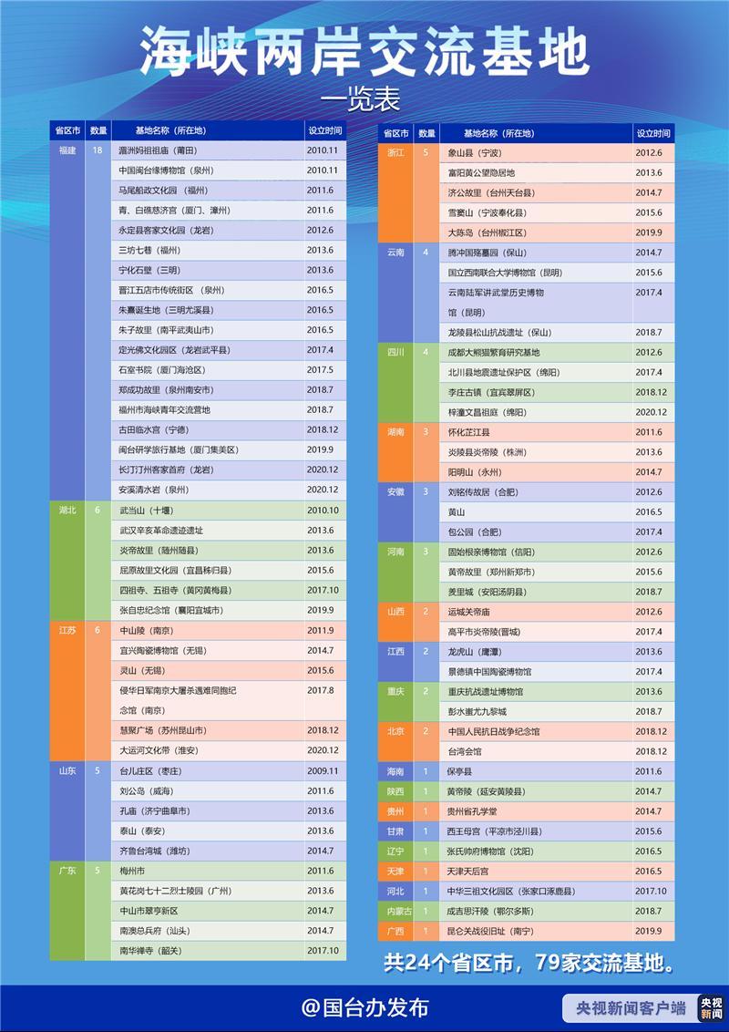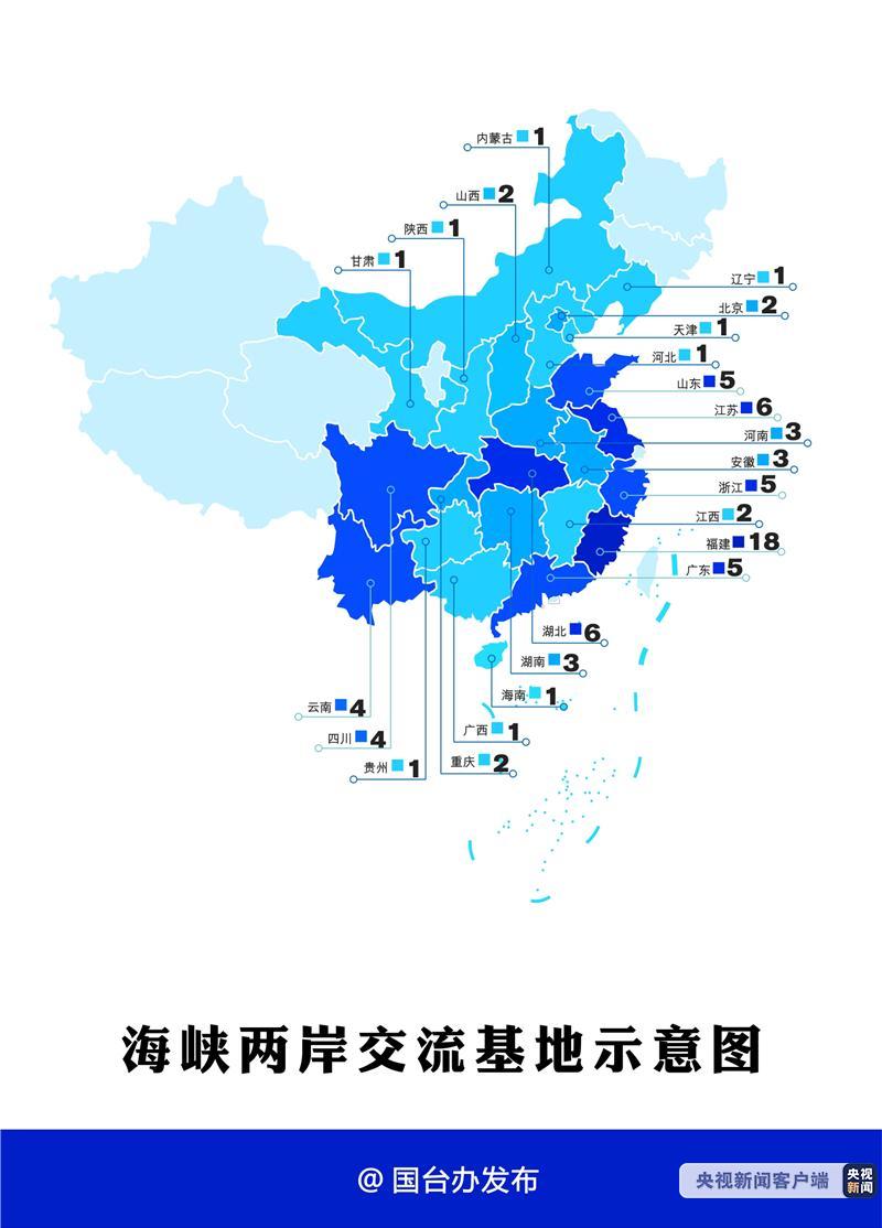 朱鳳蓮表示,兩岸同胞開展各領域的交流合作,是推動兩岸關係發展的重要動力。從2009年以來,中共中央台辦、國務院台辦在山東、湖北、福建等24個省區市批准設立了79家海峽兩岸交流基地:福建目前有18家交流基地,江蘇、湖北各有6家,山東、浙江、廣東各有5家,雲南、四川有4家。