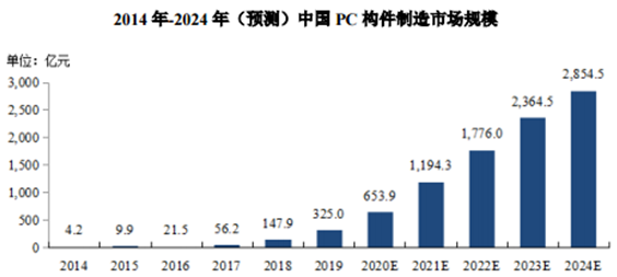 根據全聯房地產商會發布的行業報告,國內裝配式建築PC構件的市場規模從2014年的4.2億元增長到2019年的325.0億元,年均複合增長率達到138.2%,預計到2024年市場規模將進一步增長到2,854.5億元。隨着裝配式建築技術標準的不斷完善、相關推進政策的實施和建築行業勞動力短缺成本提升以及建築業日益提高的節能環保要求,PC裝配式建築的滲透率和裝配率都將顯著提升,裝配式建築行業以政府主導為主將向多元化轉變,從而推動我國裝配式建築PC構件市場快速增長到一個新的歷史水平,2014-2024年國內裝配式建築PC構件的市場規模,預估將同比增長680倍,前景十分廣闊。