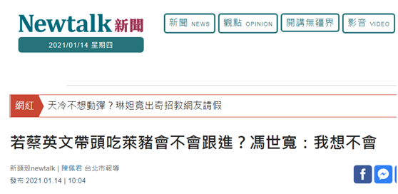 若蔡英文帶頭吃萊豬會不會跟進?台前“防長”馮世寬:我想不會