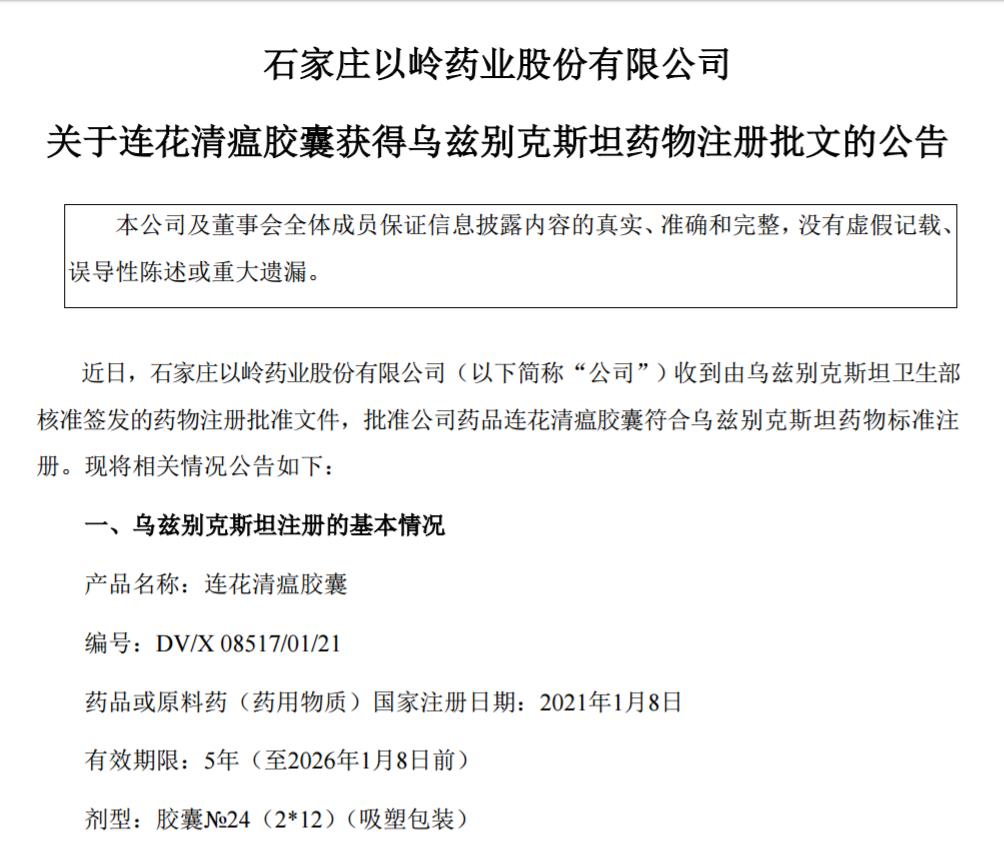 以嶺藥業1月14日發佈公告,收到由烏茲別克斯坦衞生部核准簽發的藥物註冊批准文件,批准公司專利中藥連花清瘟膠囊符合烏茲別克斯坦藥物標準註冊。