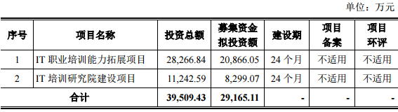 招股書顯示,公司本次募集資金擬投資額3.95億元,主要用於IT職業培訓能力拓展項目、IT培訓研究院建設項目。如下圖: