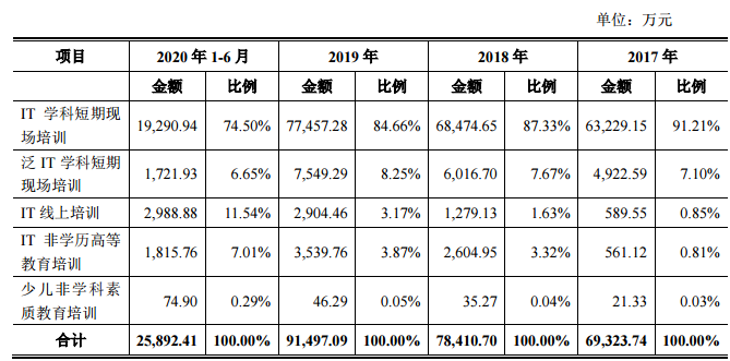 傳智教育主營業務收入可分為IT短期培訓、IT非學歷高等教育培訓和少兒非學科素質教育培訓三大業務線。按照不同業務劃分,近期內公司主營業務收入構成情況如下: