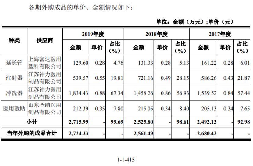 根據招股書披露,林華醫療存在外購成品再對外銷售的業務種類,以外購成品的主要供應商“江蘇神力醫用製品有限公司”為例,林華醫療向該供應商採購注射劑、沖洗器成品,各年度採購額均在兩千萬元左右,並使該供應商成為公司的第一大供應商。同時,林華醫療以經銷模式作為公司主要銷售模式,2017 年度、2018 年度及 2019 年度公司經銷收入佔公司主營業務收入的比例分別為90.61%、89.50%及 91.80%。