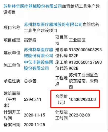另據公開信息顯示,林華醫療與“中億豐建設集團股份有限公司”簽訂了大額建設合同,合同金額高達上億元,為林華醫療建設“血管給藥工具生產建設項目”,該項目對應地塊是林華醫療在2019年獲得的位於“蘇州工業園區朱街西、金陵東路南”的地塊,與本次IPO募投項目並不相關。但是對於已經簽訂了上億元建設合同的“中億豐建設集團股份有限公司”,招股書都未作出披露。