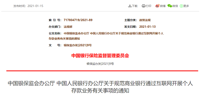 【環球網 記者 譚雅文】1月15日,銀保監會、央行發佈了《關於規範商業銀行通過互聯網開展個人存款業務有關事項的通知》,規定了商業銀行不得通過非自營網絡平台開展定期存款和定活兩便存款業務,而通過非自營網絡平台已經辦理的存款業務,到期後自然結清。