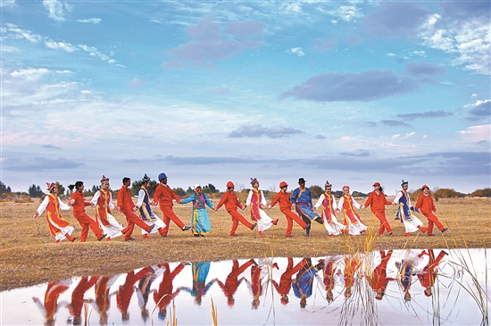蘇里格氣田在開發中堅持將發展成果惠及當地牧民,員工與牧民手拉手共跳蒙古舞。