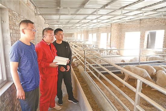 2020年6月22日,長慶油田採氣二廠駐村第一書記杜曉軍(中)正在湖羊養殖基地查看湖羊飼養情況。