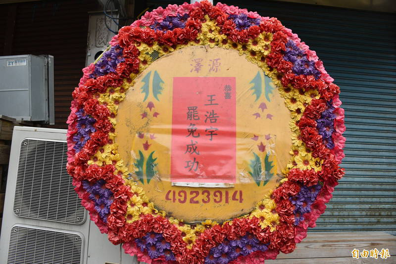 “恭喜罷免成功”,曾惡意攻擊韓國瑜的綠營議員王浩宇被罷免後,收到“恭喜”花圈