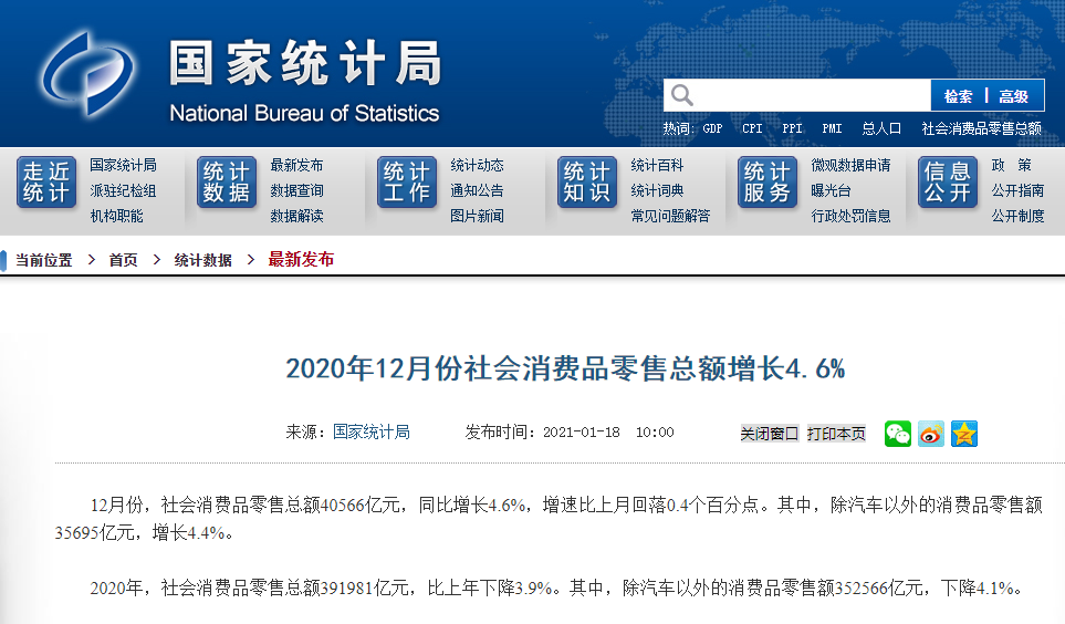 統計局1月18日發佈數據顯示,2020年全年社會消費品零售總額391981億元,比上年下降3.9%。全年全國網上零售額117601億元,比上年增長10.9%。其中,實物商品網上零售額97590億元,增長14.8%,佔社會消費品零售總額的比重為24.9%,比上年提高4.2個百分點。