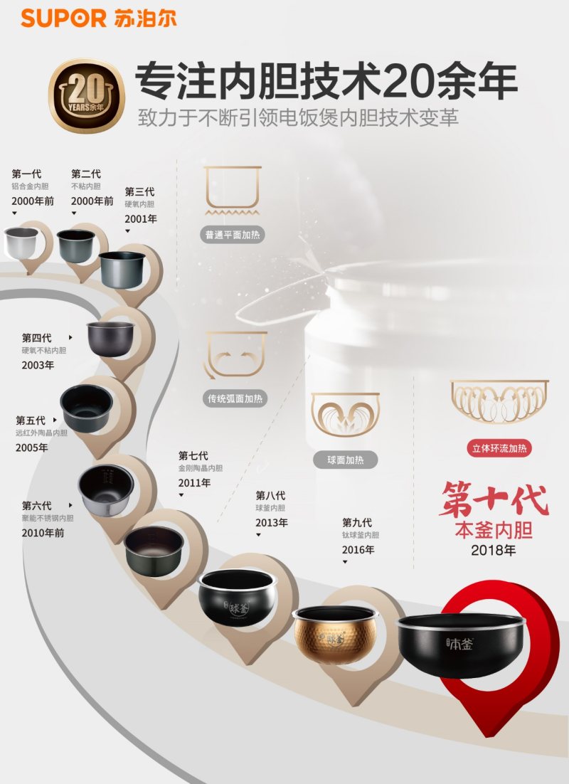 2021年,蘇泊爾上市了中國第一台遠紅外本釜電飯煲。這款電飯煲可以説集大成於一身。除了採用本釜內膽外,它還在頂部運用獨家研發的遠紅外電磁加熱技術,實現了米粒360度的環繞立體加熱。