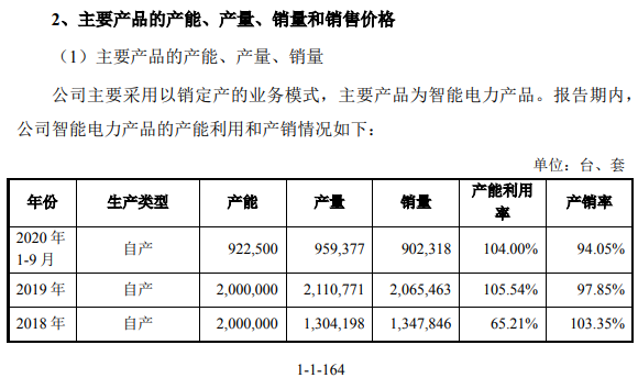 也即,該募投項目目前已經部分達產,並形成了不小的新增產能。但在此背景下,招股書第164頁顯示,煜邦電力2020年前三季度的自產產品產能,甚至不到2019年全年的一半,這指向2020年前三季度的年化產品產能,相比2019年明顯減少,這也與“年產360萬台電網智能裝備建設項目”已建成產能為197.49萬台/年的信息存在矛盾。