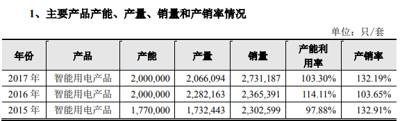 不僅如此,根據煜邦電力在2018年1月發佈的招股書顯示,2017年智能用電產品的銷量為273.12萬隻,而在本次招股書中顯示的2017年銷量則為203.29萬元,兩組數據之間相差近70萬隻,產銷率也從早先披露的132.19%下降至本次披露的98.38%。