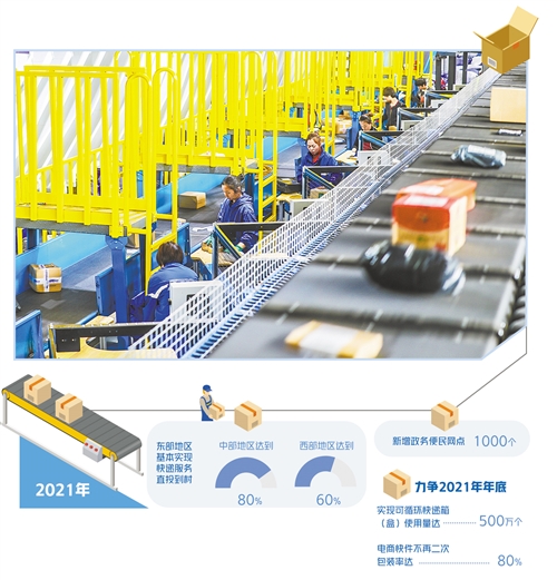 “2021年,要提高建制村快遞服務通達率,東部地區基本實現快遞服務直投到村,中、西部地區分別達到80%和60%。”國家郵政局辦公室副主任侯延波日前在新聞發佈會上表示,下一步,國家郵政局將落實快遞進村三年行動方案,編制快遞進村指引,明確進村標準,因地制宜推動郵快、交快、快快合作多模式並進,多品牌快遞服務有效下沉,提高覆蓋率,更好服務“鄉村振興”戰略,“新增政務便民網點1000個,鞏固提升建制村直接通郵成果,西部地區建制村每週三班以上投遞比率超過95%”。