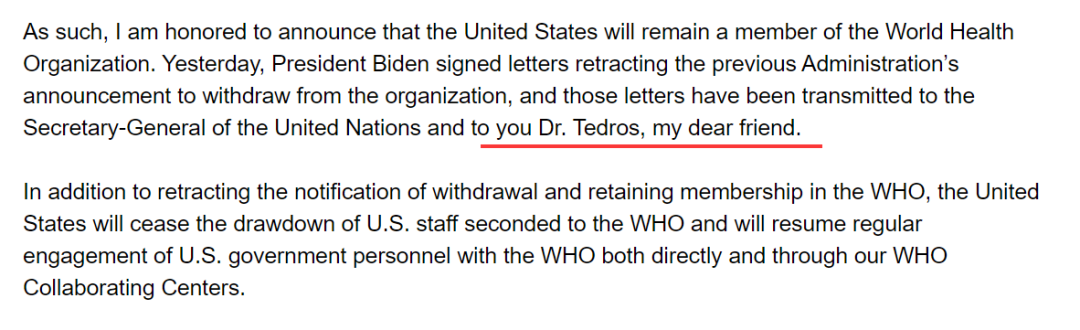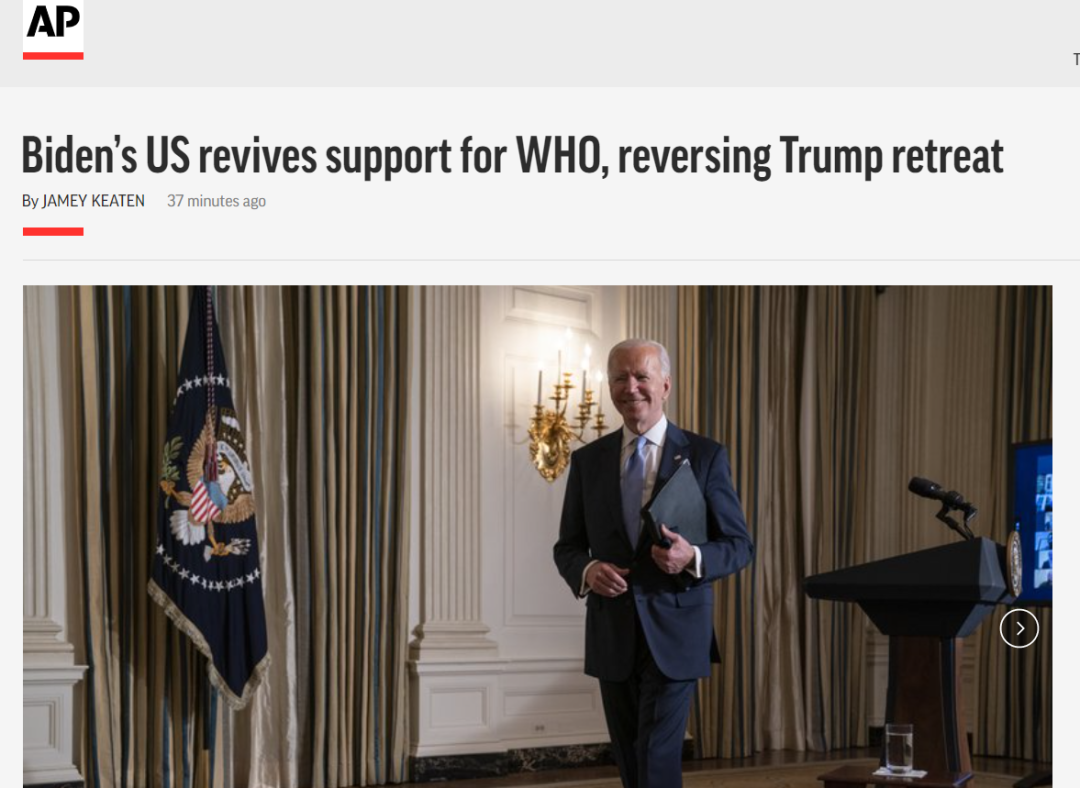 其中,除了重新加入《巴黎氣候協定》,拜登還宣佈美國將重新回到被特朗普當局在新冠疫情期間不斷攻擊和污衊、進而退出的世界衞生組織。