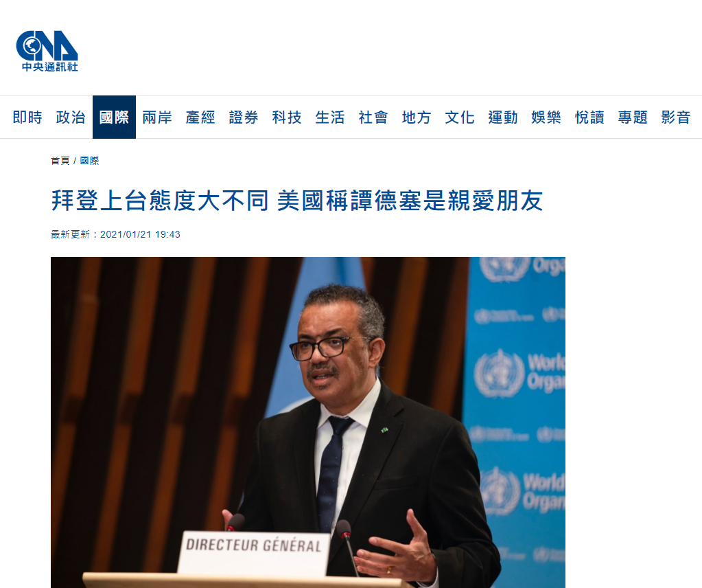 然而,對於去年曾經跟着特朗普一起攻擊世衞組織、更發動網絡水軍對譚德塞本人進行種族主義攻擊的民進黨當局來説,這一幕就頗為尷尬了。