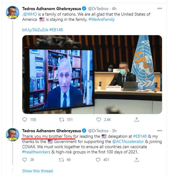 如今,面對代表美國拜登當局的福奇所展現出的全新姿態,世界衞生組織也當即對美國的歸來表示了歡迎。譚德塞本人更同樣親切地將福奇稱為“我的託尼兄弟”。