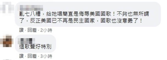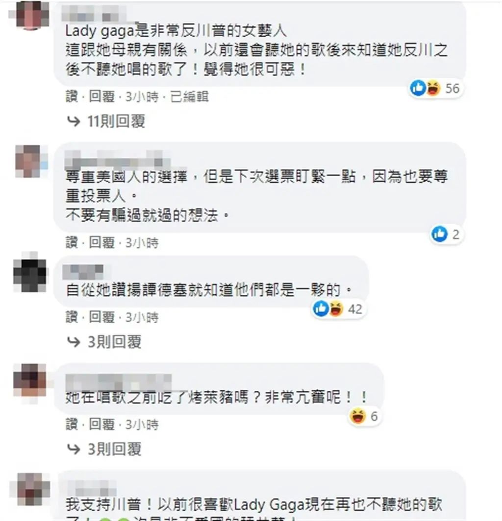 甚至連Lady Gaga也遭了殃。台灣“川粉”留言罵Lady Gaga唱歌難聽:“亂七八糟,給她(Lady Gaga)唱簡直是侮辱美國國歌!不過也無所謂了,反正美國已不再是民主國家,國歌也沒意義了!”“殺豬聲嗎?”“慶幸我從來沒有買過她的作品。”
