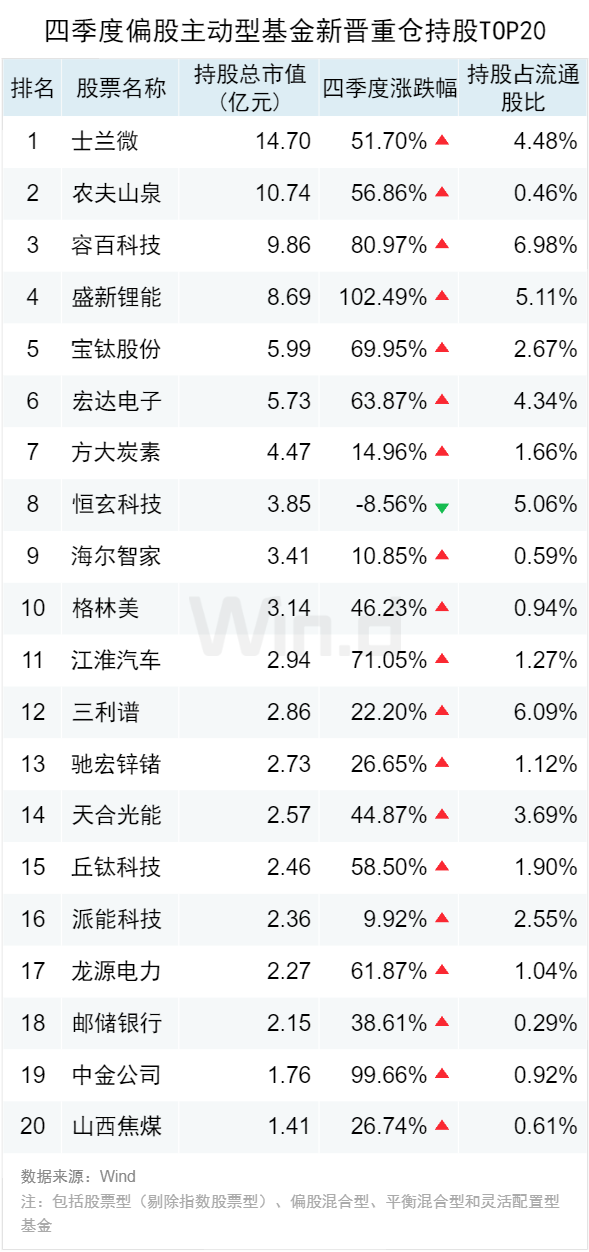 2020年四季度,士蘭微、農夫山泉和容百科技成為偏股基金新晉重倉持股市值排名前三的個股。